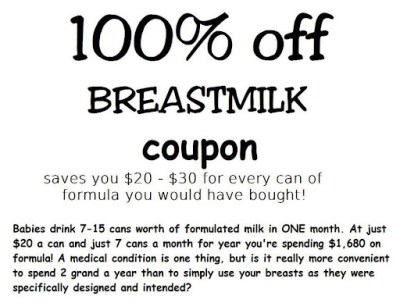 It’s time to listen to logic, Nature, Science and even Religion when it comes to breastfeeding. Don’t let media dictate where you put your money and what you put into your sweet baby. Don’t be afraid to nurse in public if your baby is hungry in public. Do not feel ashamed if you want to use a cover; do not feel ashamed if you don’t. Think with me a minute: Are you going to let the uninformed opinion of complete strangers dictate the choices you make for your children? If so, you’ve got a lot of introspection to do on much more than breastfeeding.
