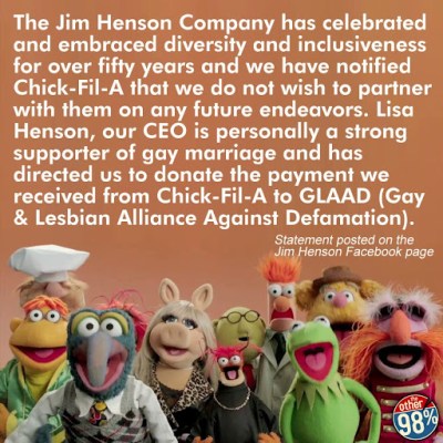 In light of Chik-Fil-A’s recent clarification that that are, indeed, anti-marriage equality, The Jim Henson company has chosen to sever ties with the fast food corporation, followed by the following announcement on Facebook: