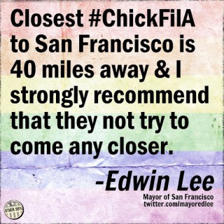 These reprovals are from leaders of huge, metropolitan cities- not to mention the thousands of individuals, myself included, who will never give them another cent. I care about my gay friends WAY more than I care about a particular brand of fast food chicken, -or humanist-turned-homophobe children’s books, thankyouverymuch.